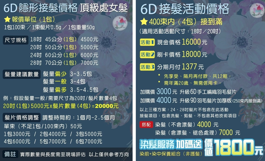 目前電話亭Hair Salon逢甲店提供兩種接髮服務,6D羽毛接髮與9D鉑金接髮,兩種優勢如下: